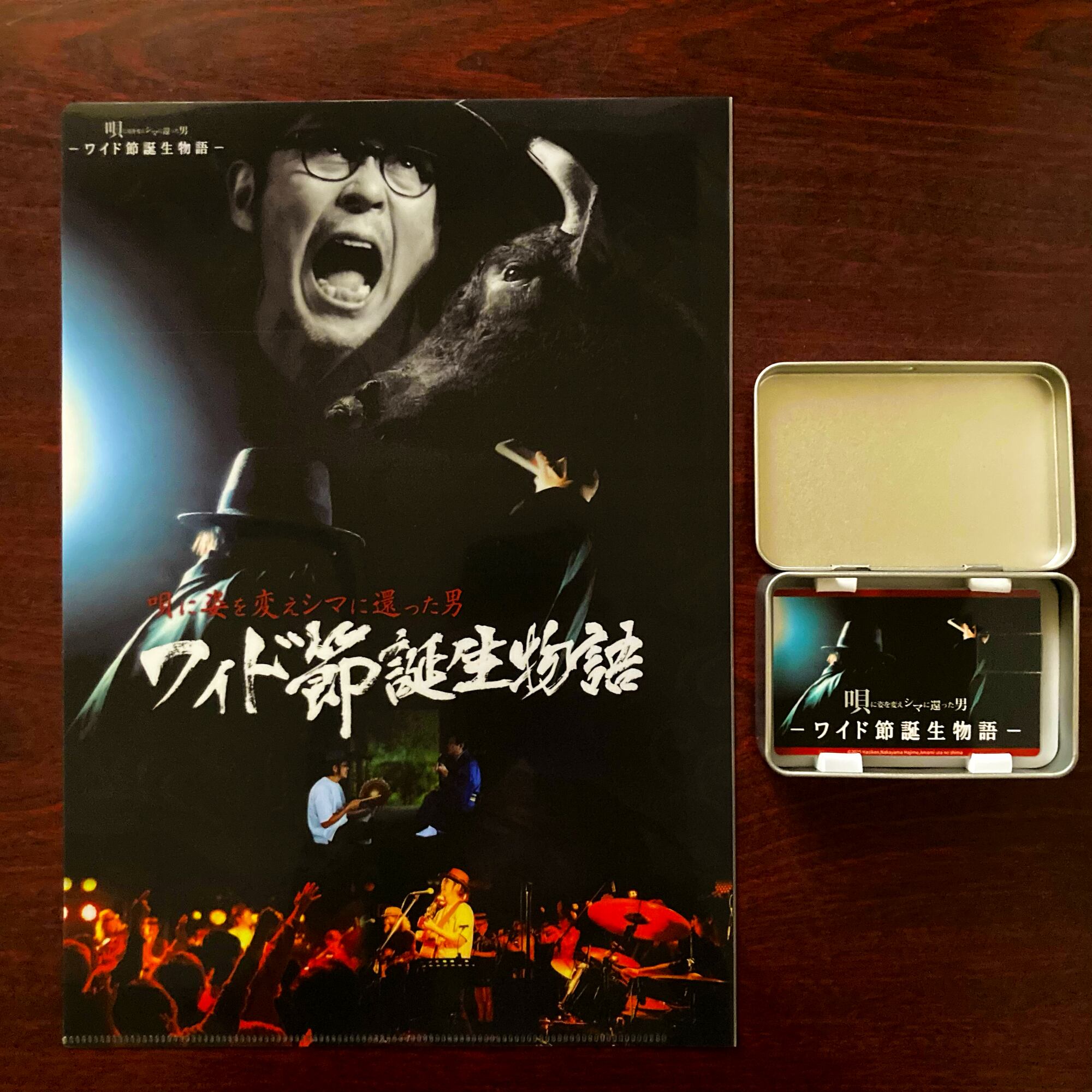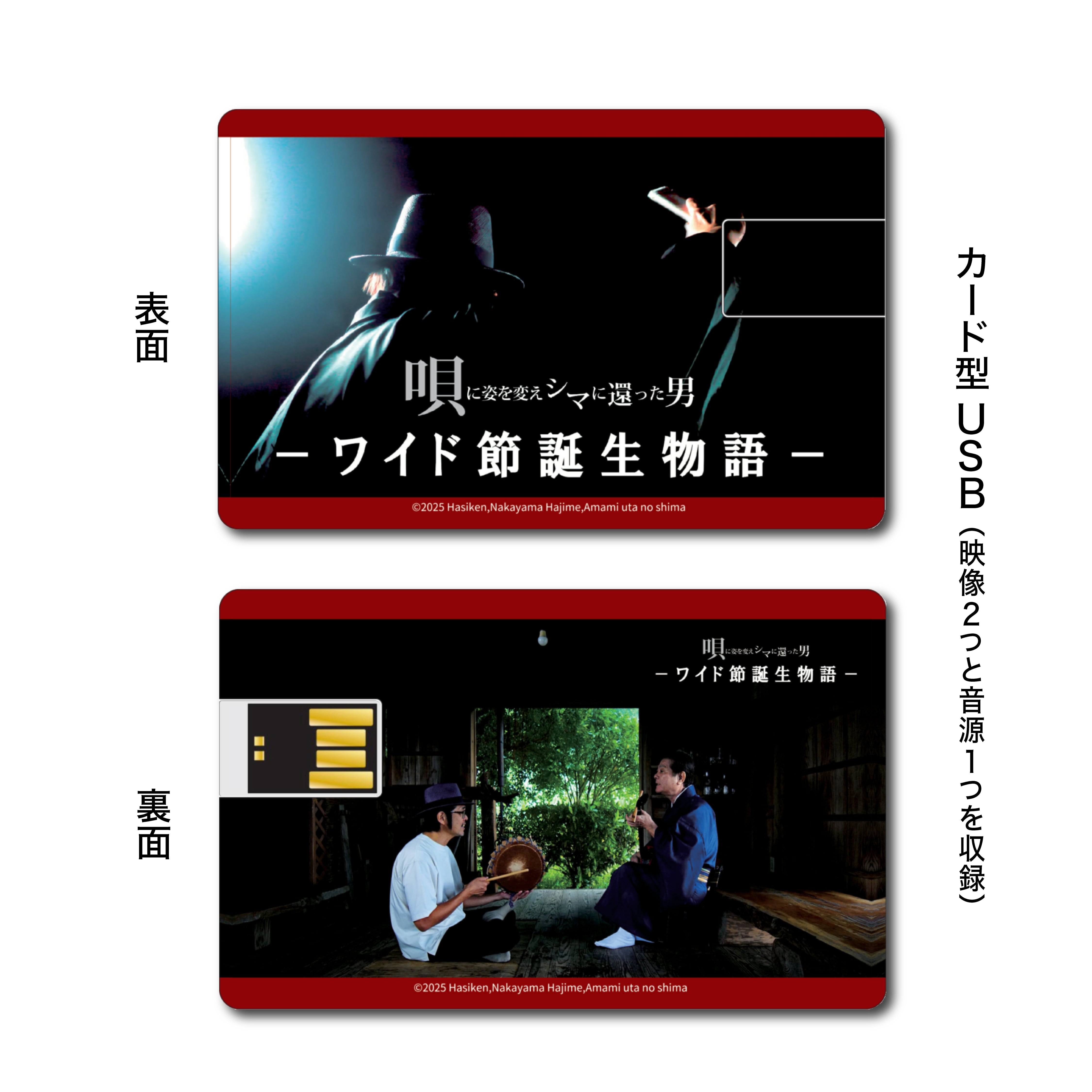 『唄に姿を変えシマに還った男ーワイド節誕生物語』本編とトレイラー映像、映像の中で使われた音源をハイレゾで収録した『tinplateケース入りカード型USB』。USB-Aの差し込み口があるパソコン、ブルーレイ/DVDプレイヤー、テレビで鮮明で迫力ある映像を楽しんでいただけます!奄美で行われたスペシャルLIVEのポスターに使われたデザインを施した特製クリアファイルと「WAIDO2025Tシャツ」の豪華セットです。