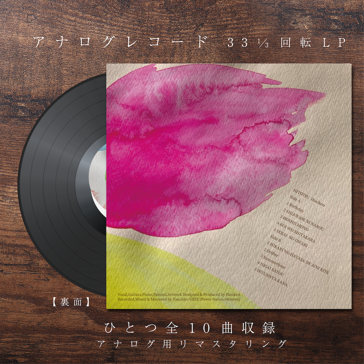 ジャケットに使用してる絵はハシケンがこのアナロレコードのために描いたものです。ジャケットや盤の両面に施された絵まで、細部に渡ってハシケンが「ひとつ」の世界を仕上げています。